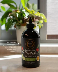 Extra virgin olive oil from Akrotiri, Chania, Koroneiki variety. Cold pressed, rich in polyphenols. In a practical squeeze packaging for easy dosage. Ideal for salads and everyday use.