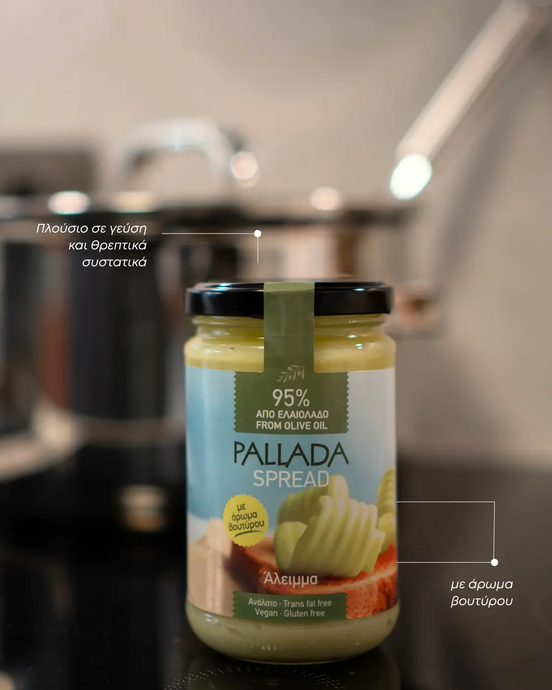 PALLADA SPREAD is an innovative olive oil spread, designed to replace butter and margarines in the daily diet, without compromising on taste or quality.
